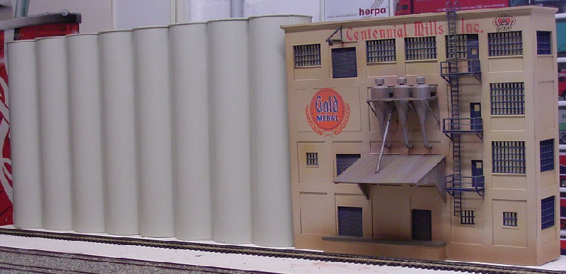Das erste Gebäude für die "Kulisse" des ersten Teils des Abstellbahnhofs. Die Bausätze stammen aus der "cornerstone" Serie von Walthers. Ein Mühlengebäude mit Getreidesilos. Die Silos sind normalerweise zu viert in Zweierreihe angeordet. Andy hat die Silos in der Mitte getrennt und nebeneinander angeordnet. Die Siolos werden noch um Dachaufbauten und einen Förderturm ergänzt. Vor den Silos wird eine im Gleisbett liegende Enleerungsgrube für die Silowagen eingebaut. Links neben dem bereits gealterten Mühlengebäude wird ein Lagergebäude (Dreieck) im Selbstbau in etwa gleicher Höhe entstehen. Im Erdgeschoß mit überbauter Laderampe. Im hinteren Teil wird die Zufahrtsstraße zum angrenzenden (im Bau befindlich) Container/Trailer-Bahnhof "verschwinden. Mit dem Bau wird begonnen, wenn Walthers (endlich) alle Fassadenteile geliefert hat.