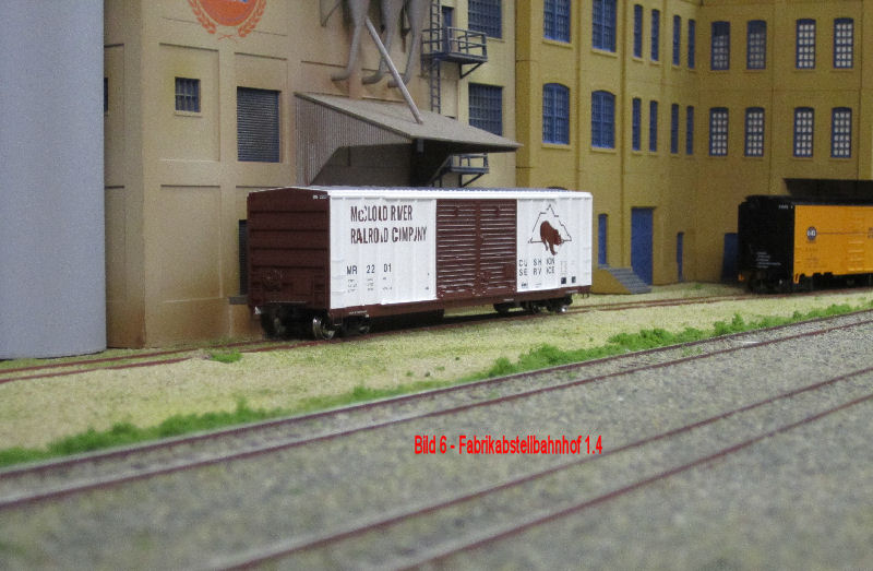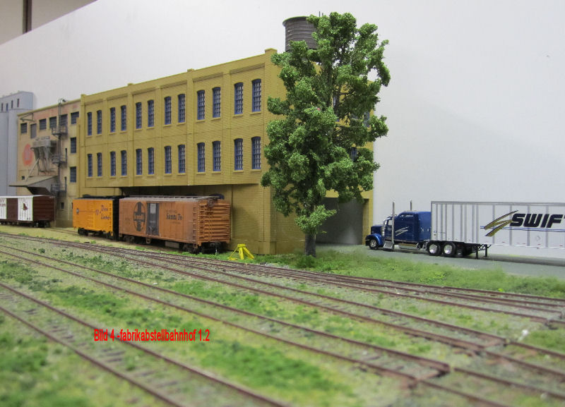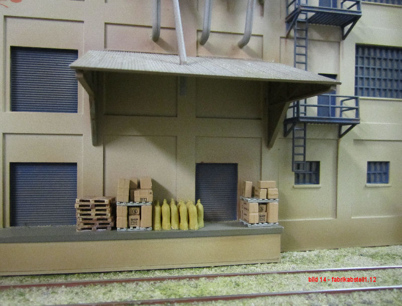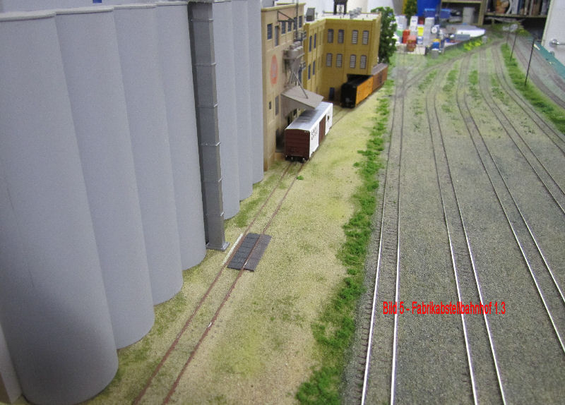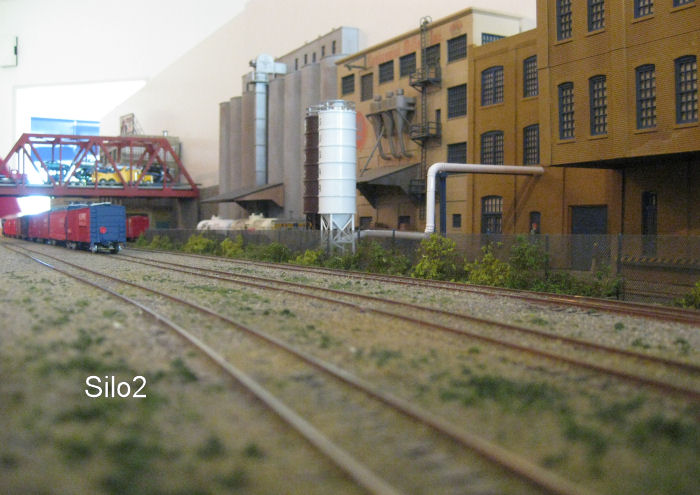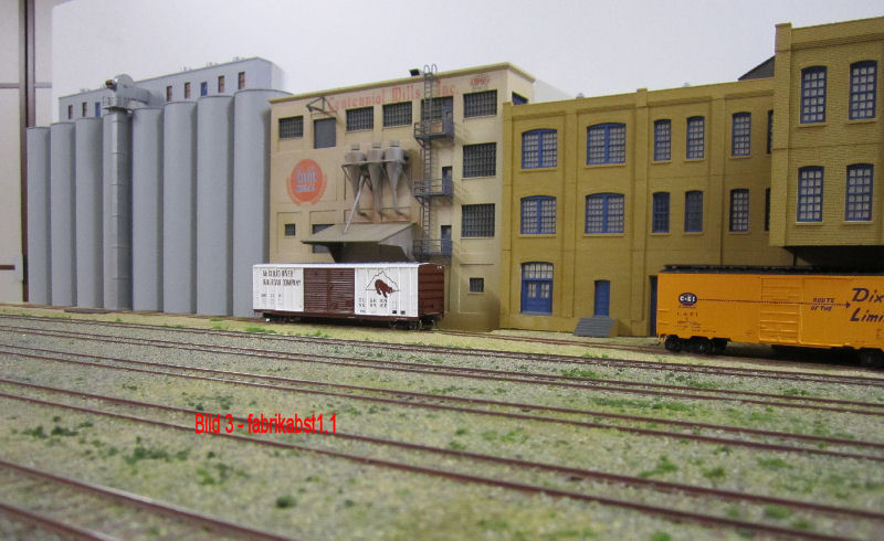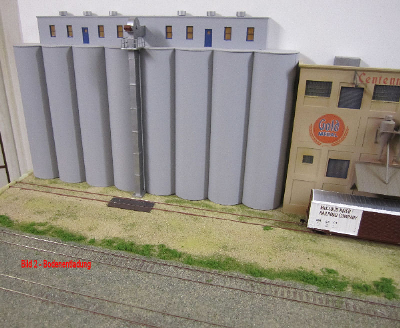 Bild 1 und 2 - Nachdem die Fabrikgebäude (Getreidemühle mit Silo und angeschlossener Brot-/Backwarenfabrik) bis auf die farbliche Alterung und die Werbebeschriftungen fertig sind, haben wir mit dem Geländestreifen zwischen Fabrik und Güterbahnhofgleisen begonnen. Für die Bodenentladung der Silowagen vor dem Speichergebäude hat Andy aus Auhagen-Teilen die Bodenklappen und die seitlichen Bretterabdeckungen gefertigt und lackiert. Das Silogebäude wird nun noch im Bereich der Entladung ein Schutzdach erhalten.