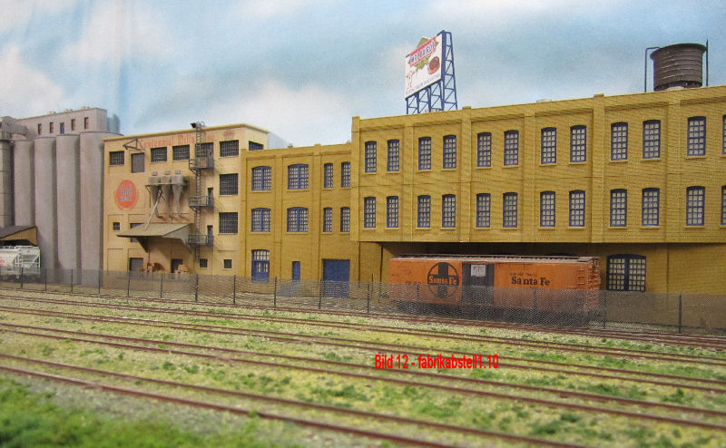 Bild 11 und 12 - Andy hat, ähnlich wie am Containerbahnhof, das Fabrikgelände mit einem Maschendrahtzaun eingezäunt. Die Herstellung des Zauns ist weiter oben beschrieben. Damit ist das Gelände gegen Kuchenklau gesichert! Auf der Kulisse ist probeweise ein Wolkenhintergrund angebracht.
