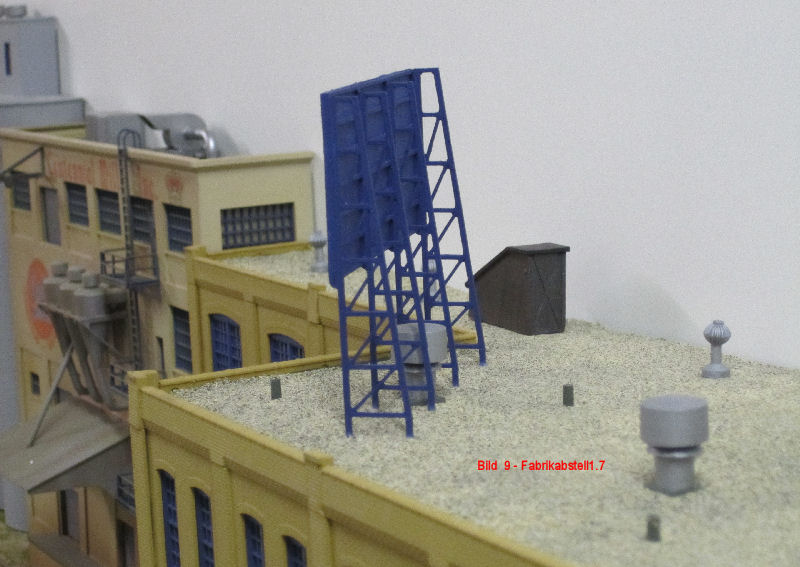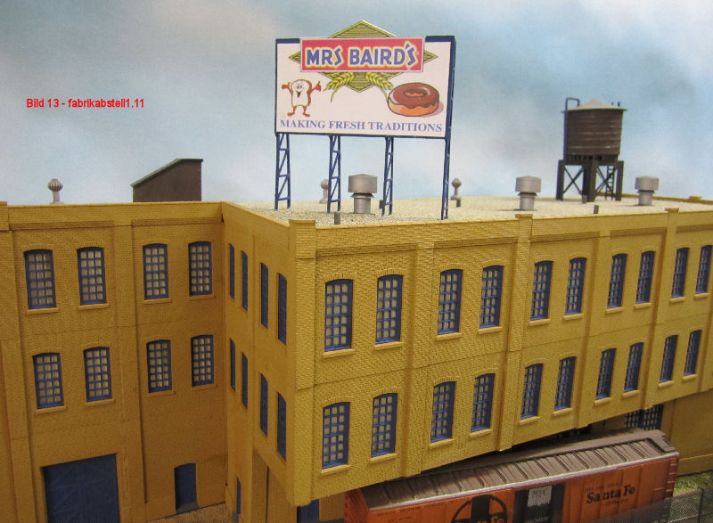 Bild 9 und 10 - Auch die Werbetafel für die Brotfabrik ist gebaut, lackiert und aufgestellt. Nun quälte Andy das Internet für "passende" Brotfabriknamen für die Tafel und die Gebäude. Die Werbetafel stammt von Gunter`s Car Company - Us-Gebäude - Dach Detail- Set 2 - # 3012.
