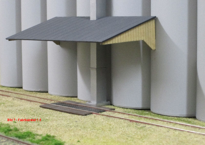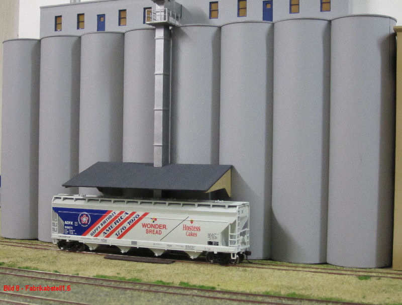 Bild 7 und 8 - Andy hat dem Silogebäude über der Bodenentladestelle ein Vordach verpaßt. Jetzt bleibt das Korn trocken. Die Teile für das Vordach hatte Andy in der Restekiste. Den Hopper kannte ich auch noch nicht!