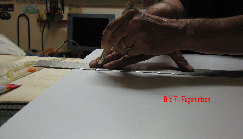 Bild 6 - Nun müssen die Fugen der einzelnen Betonplatten geritzt werden. Die einzelnen Platten werden 4 x 2 cm groß. Die Maße haben wir mit Bleistift auf die Platte übertragen. DasEinritzen der Fugen wird mit einer Radiernadel ausgeführt. Um wirklich gerade Fugen zu erhalten, führen wir die Nadel an einer Aluschiene vorbei.