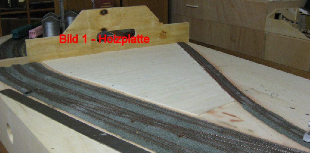 Bild 8 - Die fertige Platte - nix zu sehen bei unseren Fotografierkünsten! Aber die Farbe folgt! Auf diesem Foto ist gut der Magnet für den Entkuppler der Kadeekuplungen zu sehen.