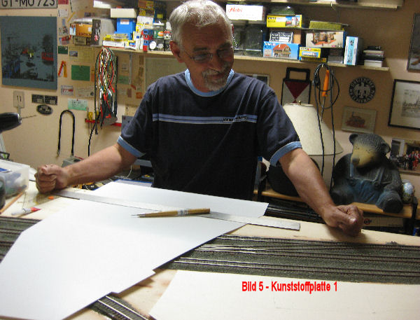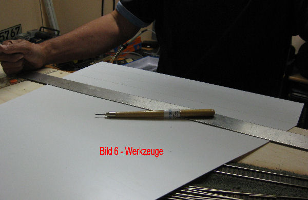 Bild 5 - Auf den bisher gefertigten Aufbau wird jetzt eine 1 mm starke Kunstoffplatte aufgelegt. Zum genauen Ausschneiden der Platte habenwir uns wieder eine Papierschablone angefertigt. Die Platte kann mit einemscharfen Cuttermesser oder Scalpell ausgeschnittenwerden.