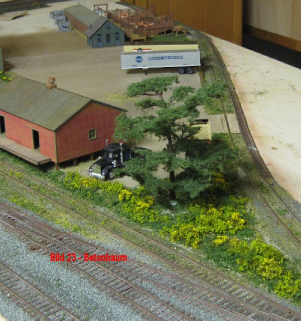 Das erste Grün wächst. Die Flächen wurden deckend mit unverdünntem Weißleim (Ponal) eingestrichen. Danach wurde an mehreren Stellen Splittsorten von Asoa mit den Fingern aufgerieselt und dann vollflächig eine Mischung aus mehreren Turfs von Woodland mit einem Sieb aufgetragen. Nach dem Abtrocken kann das überschüssige Material mit einem Pinsel entfernt und wiederverwendet werden. Der Baum aus dem Walthers-Programm (Weissmetall) wurde bereits braun lakiert. Er bekommt noch ein Farbfinish und natürlich seine Belaubung. Die bisher verwendeten Materialien finden Sie im Bild 17 unter Bauanleitungen. Bilder über die Fertigstellung des Baumes folgen.