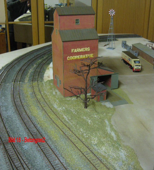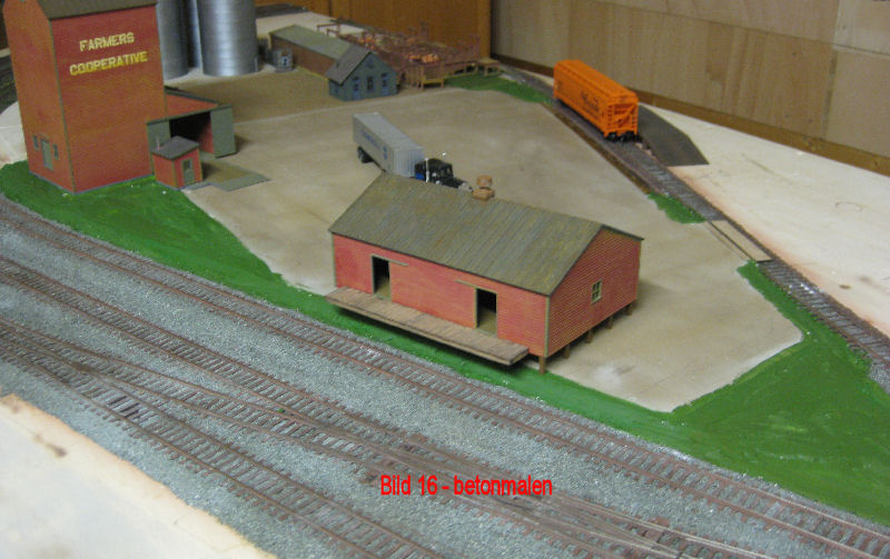 Bild 16 - Die Kanten der Betonplatte zum Gleis/Landschaft wurden mittels Palettmesser mit Gips aufgefüllt. Im Bereich der Ladestraße bis zur Schwellenoberkante. Im Bereich des Lagerhauses und des Getreidelagers wurde ein Graben (Wasserablauf) geformt. Nach dem Aushärten des Gips wurden die Flächen mittels Abtönfarben (Mischung aus grün und braun) aus dem Baumarkt eingefärbt. Nach dem Abtrocknen der Farbe kann mit dem "Begrünen" begonnen werden. Die Materialien finden Sie im Bild 15 unter dem Button Bauanleitungen.