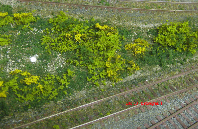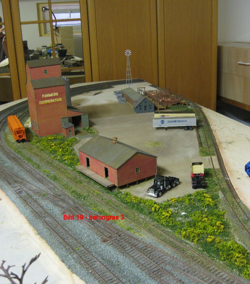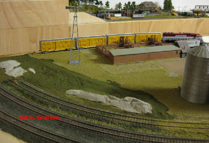 Bild 27 - Die Ränder zum Gleis hin wurden mit Basaltsand und Stein/Kies/Schroppen von Asoa sowie Turfs von Woodland und einer Flockenmischung von Woodland und Heki eingestreut. Das erste Wiesengrün und das Gelände um die Silos (Zugangswege Asoa-Kies) wurden wieder mit einer Mischung mehrerer Turfs von Woodland mit dem Sieb aufgetragen (siehe unter Bauanleitungen).