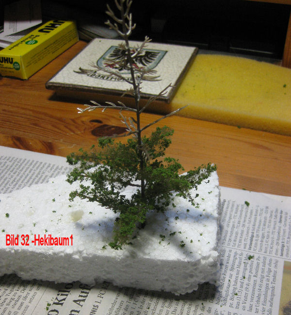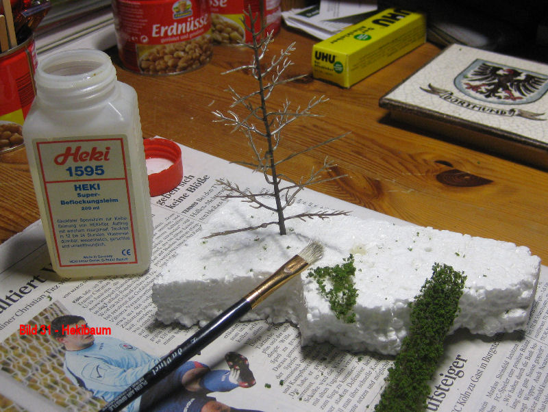 Bild 31 - Ich hatte in meinem Fundus noch eine Packung Baumbausätze von Heki (Nr. 1532). Der Bausatz besteht aus 15 Kunstoffrohlingen und dem Flormaterial. Mir waren die Dinger immer irgendwie zu klein. Habs dann jetzt trotzdem mal probiert. Die Äste des Kunststoffspritzling werden zuerst in alle Richtungen vom Stamm weggebogen. Danach mit dem Flormaterial belegt. Zum Kleben eignet sich natürlich der Heki-Beflockungsleim 1595. Von der Flormatte habe ich mit der Schere kleine Streifen abgeschnitten und diese Streifen dann in Form und Länge der jeweiligen Äste auseinandergezogen. Danach die Äste mit Leim eingestrichen und das Flormaterial aufgelegt und leicht in Form gedrückt. Ja, ich mag Aapenös - und Dortmund ist die Heimatstadt meiner Mutter incl. BVB.