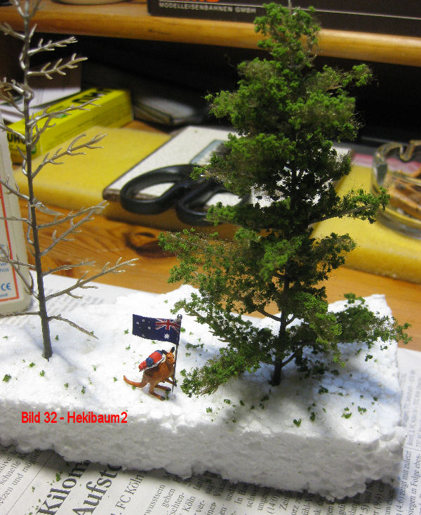 Bild 33 - Ein Baum ist fertig. Im Größenvergleich mit Skippy (siehe unter Bildern) doch eine anständige Größe für einen noch jungen Baum. Wer will, kann natürlich vor dem Belegen mit Flor den Baumrohling noch mit Farbe verbessern. M.E. aber nicht unbedingt erforderlich. Wenn alle Bäume fertig sind (je Baum ca 20 Minuten Bauzeit) werden sie zusammen mit der Endgestaltung dieses Teils eingebaut. Auch hiervon werden Bilder folgen.