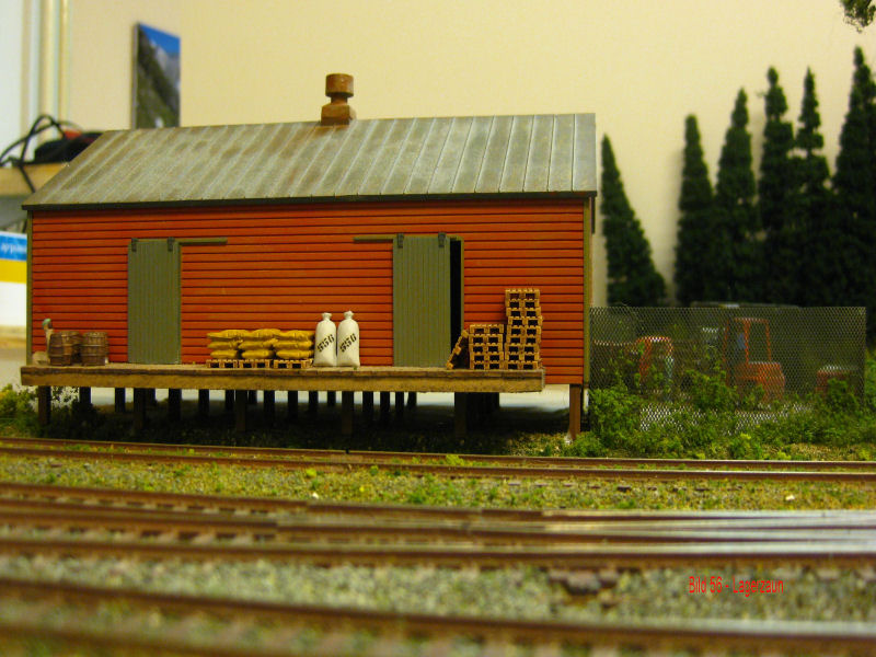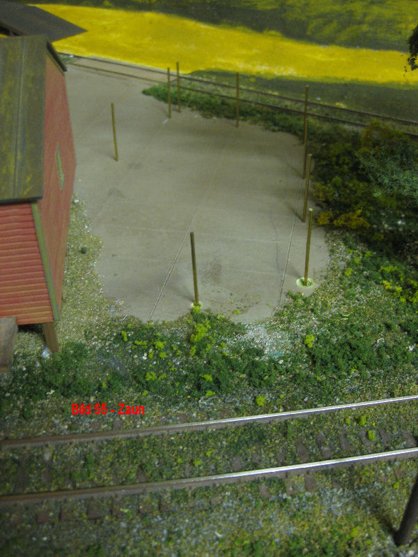Bild 55 - Neben dem Lagerhaus wird ein eingezäunter Lagerplatz entstehen. Die Zaunpfähle (Messingdraht 3cm) sind bereits gesetzt. Tor und Maschendrahtzaun befinden sich zum Lackieren bei Andy. Die Regale werden auch von Andy gefertigt.