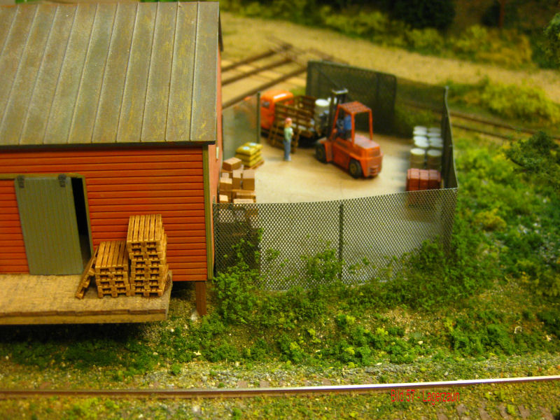 Bild 56 - Der von Andy gefertigte Zaun ist montiert. Bei einem gemeinsamen Basteltag in Bernd`s Keller am 7.8.11 hatte Andy vorbereitetes Ladegut und viele andere Ausschmückungsteile mitgebracht. Damit konnte der kleine Lagerplatz "eingerichtet" werden.