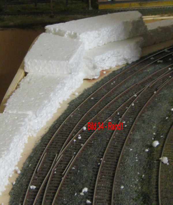 Bild 34 - Der Aussenrand des Moduls entsteht. Als erstes wurde eine 5 cm hohe Holzleiste aufgeklebt. Diese wurde dann mit der Stichsäge in der gewünschten Geländeform ausgesägt und mit der Schleifmaschine geglättet/der Außenwand des Moduls angepaßt. Danach wurden Styroporstücke mit Holzleim aufgeklebt.