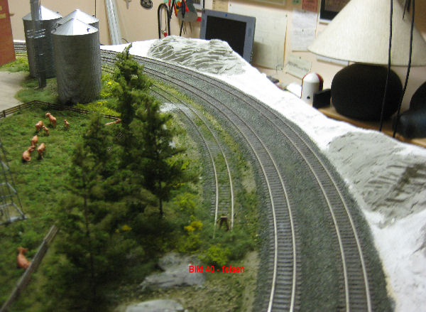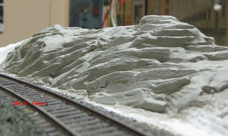 Bild 24 - Der restliche Innenraum des Moduls hinter der Ladestraße. Am Rand sind Felsen modelliert. Hierzu wurde Modellgips aufgetragen. In den noch leicht feuchten Gips wurden mit einem Palettmesser die Grundstrukturen eingearbeitet. Nach dem Trocknen wurden mit einem Stechbeitel die Felsformationen herausgearbeitet.