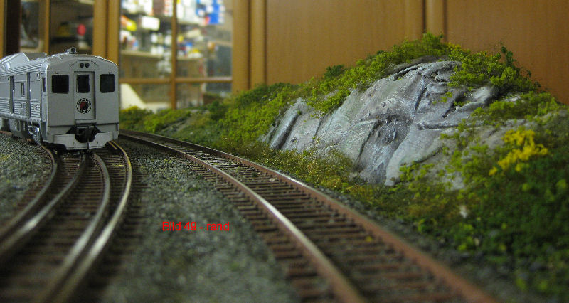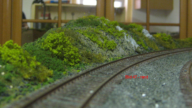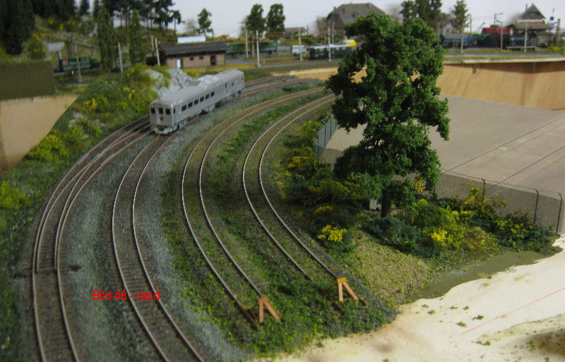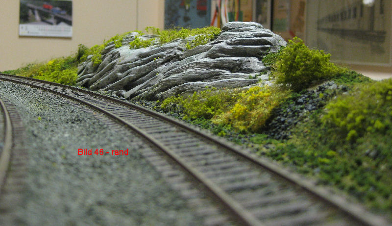 Bild 46 - Die fertig begrünte Randpartie. An einigen Stellen wurde Heki-Wildgras aufgetragen und mit Heki Flor Hell- und Dunkelgrün das Buschwerk angedeutet. Befestigt wieder nass in nass.
