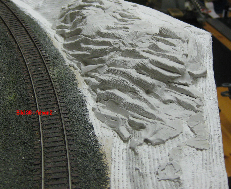 Bild 38 - Sobald die Gipsschicht trocken ist, wird mit einem scharfen Stechbeitel die endgültige Struktur herausgearbeitet. Es sollen sich halbwegs glatte Plattenoberflächen und scharfe, fast senkrecht abfallende Kanten zur nächsten Platte ergeben. Danach wird mit einer Drahtbürste leicht über den Gibs gestrichen. Hierdurch ergeben sich die typischen Riefen. Wenn das zur Zufriedenheit erfolgt ist, folgt der erste Anstrich. Verwendet wurde hier die Granitfarbe von Heki.