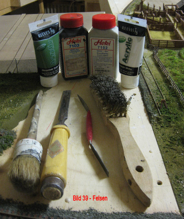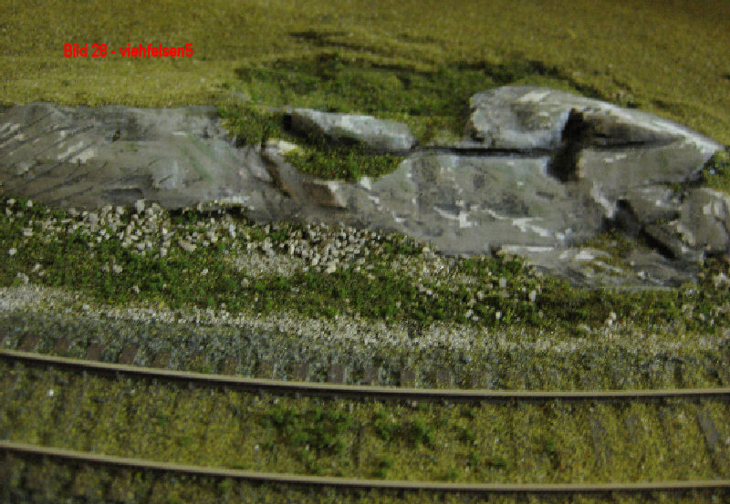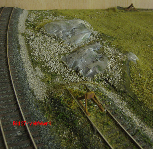 Bild 25 - Mit Heki-Granitfarbe erfolgte der erste Anstrich der Felsen. Nachdem diese Farbe abgetrocknet war, erfolgte ein zweiter Anstrich mit dunkler Heki-Lasurfarbe. Diese Farbe wurde sofort wieder mit einem nassen Tuch/Topfschwamm abgewaschen. Die dunkle Farbe bleibt dabei nur in den Vertiefungen erhalten. Hierdurch ersteht eine "Alterung" der Felsen. Es folgt der Anstrich der Restflächen mit Abtönfarbe (Mischung aus grün und braun). Nach Abtrocknung aller Farben wurden die Vertiefungen der Felsen mit grüner Acrylfarbe und die Kanten der Felsen mit weißer Acrylfarbe mit fast tocken ausgewischtem Pinsel abgezogen. Die grüne Farbe stellt die auf Felsen befindlichen Moosüberzüge dar. Die weiße Farbe setzt auf den Kanten "Lichter". Die verwendeten Materialien befinden sich wieder unter dem Button Bauanleitungen.