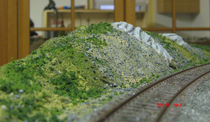 Bild 44 - es grünt! Der Hang wurde zuerst mit Ponal bestrichen. Dann wurde ein Gemisch aus mehreren, gesiebten Körnungen von Straßenschotter und Woodland-Turf Sorten aufgetragen. Nach dem Trocknen dieser ersten "Unterlage" wurden weitere (hellere) Turfsorten, Sandsorten und Heki-Flocken nass in nass aufgetragen. Nun fehlen noch höhere Gräßer und Büsche.