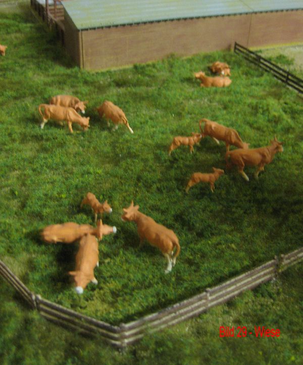 Bild 29 - Die Weide neben dem Cattleyard hat einen Zaun und ihr saftiges Gras bekommen. Der Grünauftrag erfolgte wie bei "erstem und zweitem Grün", allerdings mit weniger Sandanteilen. Büsche, Bäume, Tränke etc. fehlen noch. Das hohe Gras ist ein Hekiprodukt. Der Zaun ist von Noch. (Siehe auch unter Bauanleitungen). Kühe stehen oder liegen meistens in Gruppen. Bullen sind hier tabu!