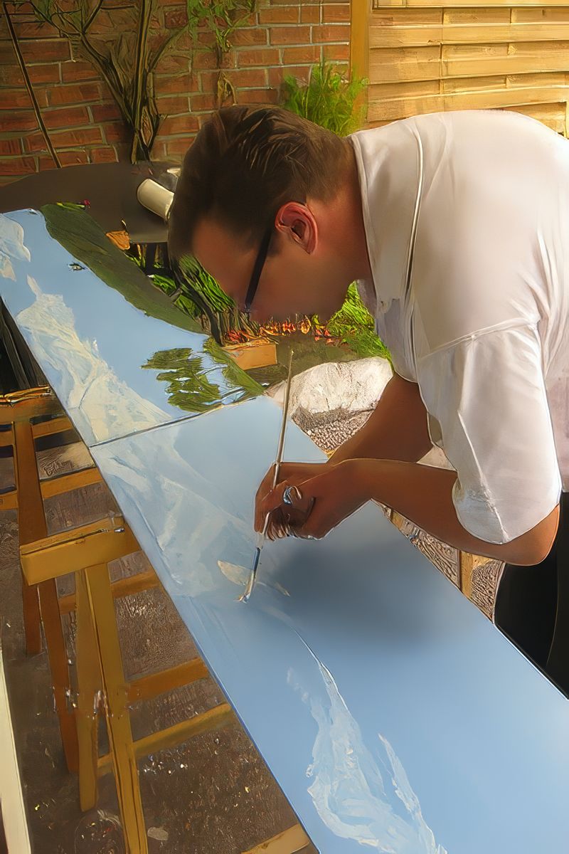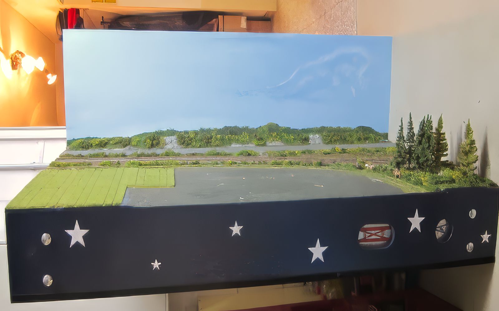 Bild 1 - wir konnten unseren Freund Martin gewinnen, unsere Hintergründe zu malen. Martin malt, neben seinem normalen Job, Landschaftsbilder mit Ölfarben. Er hat bereits den Eisenbahnkeller unseres Vereins ausgemalt. Auf unseren Holzplatten verwendet er normale Acrylfarben. Auf diesem Bild sind (nach kompletter Einfärbung des Brettes mit Blau) die Wolkenformationen in mehreren Schichten an der Reihe. Die Wirkung ist schon jetzt toll. Allerdings ist es auch auch enormer Zeitaufwand. Die Lotzburgh-Seite will er mit Ölfarben malen.