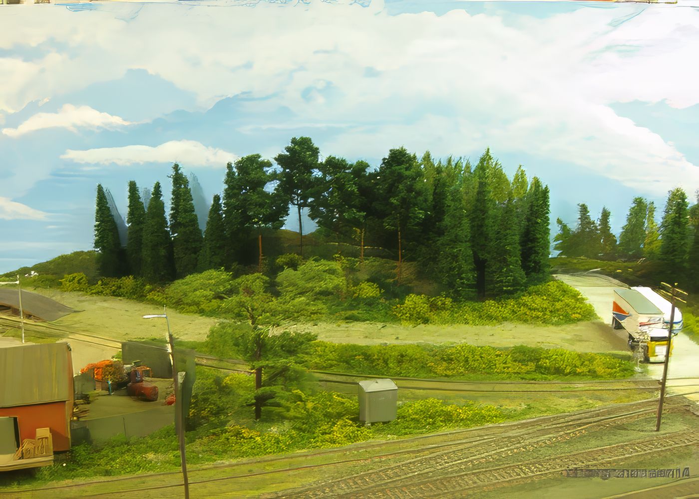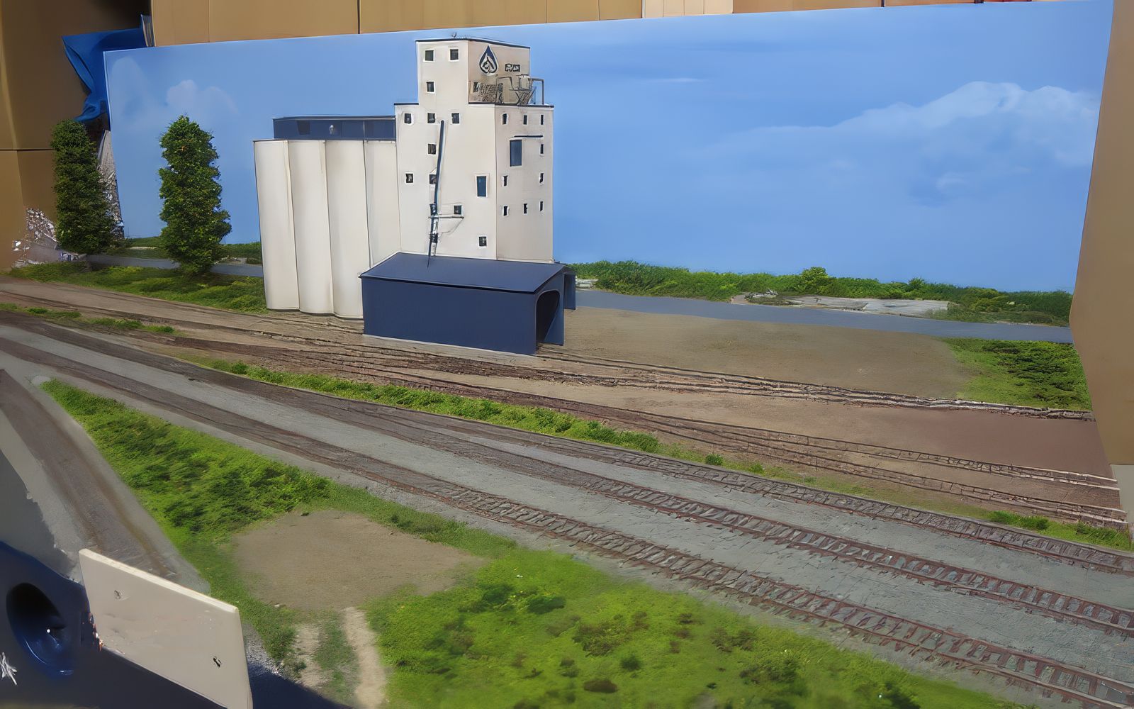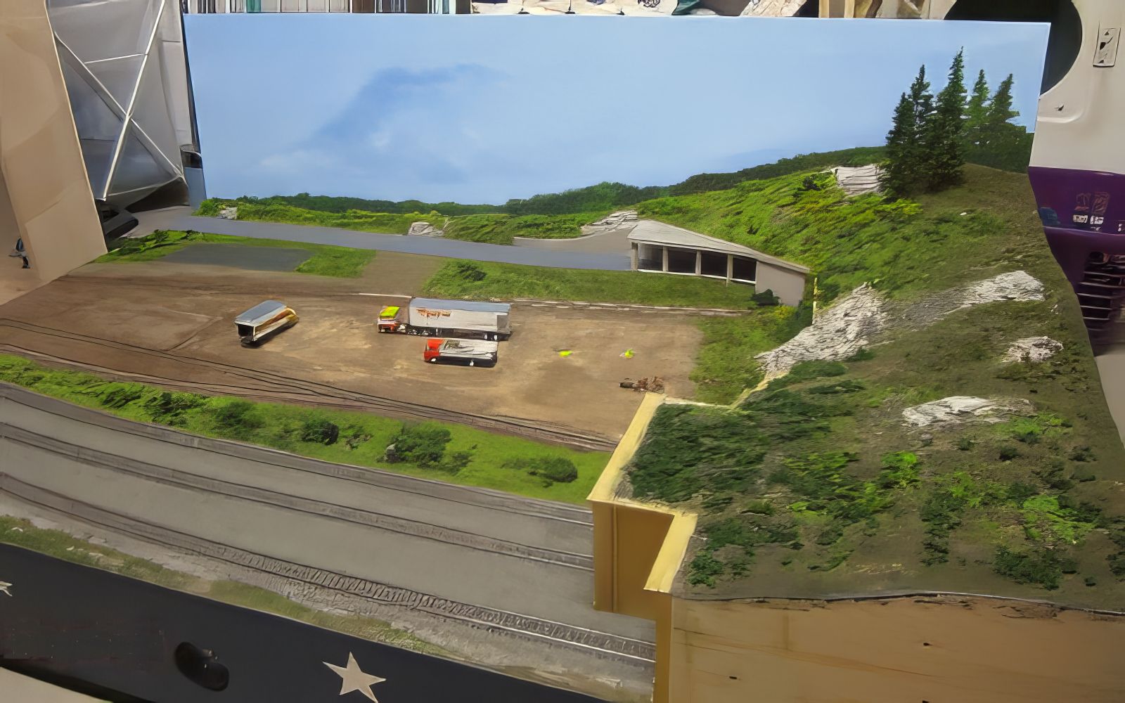 Bild 2 - Hier zwei fertige Hintergründe auf der Anlage. Für uns, wunderschön. Um die Perspektiven zu halten, ist neben der Halle ein angeschnittenes, noch nicht lackiertes Zaunteil aufgestellt.