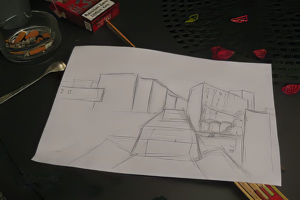 Bild 4 - Hinter dem Modul rund um Brot und Getreide geht es in unsere Stadt Dakota über. Besonders knifflich für die Hintergrundmalerei ist auf diesem Modul die Einbindung der Straße von der Brücke in die Stadt. Hier Martins Bleistiftskizze. Die Straße verschwindet nach rechts hinter der Bebauung.
