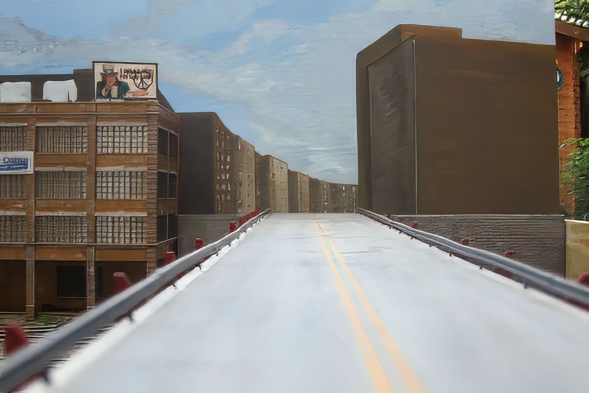 Bild 7 - Nun sind die Konturen ausgemalt. Die Straße verschwindet zwischen einer Häuserzeile nach rechts. Die Halbrelieffabrikgebäude finden ihre Fortsetzung auf dem Hintergrund.
